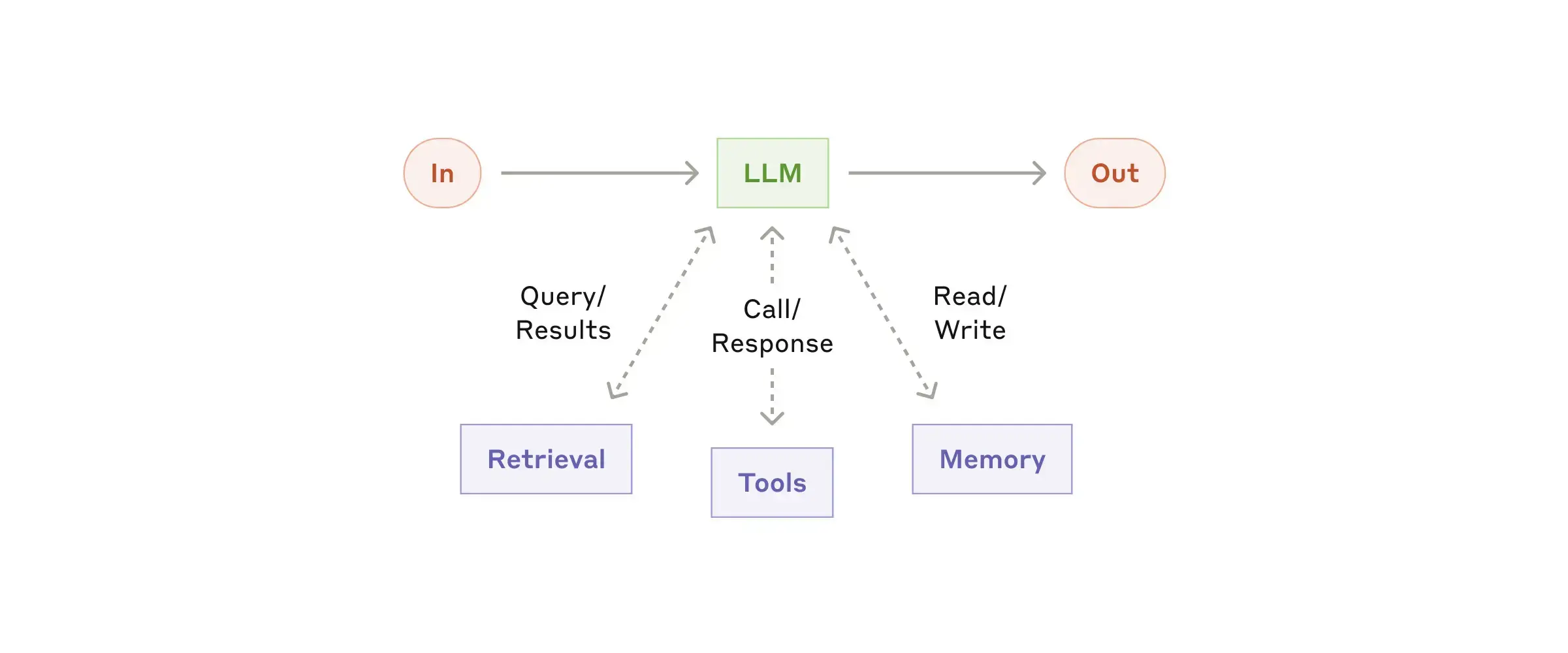 Agentic systems are built upon LLMs enhanced with retrieval, tools, and memory. These models can independently search, select tools, and retain information.