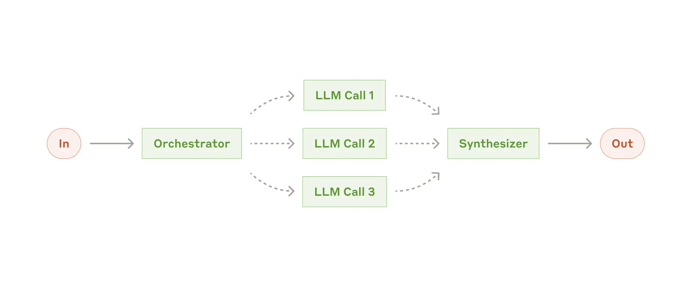 A central LLM dynamically breaks down tasks, delegates them to worker LLMs, and synthesizes their results.